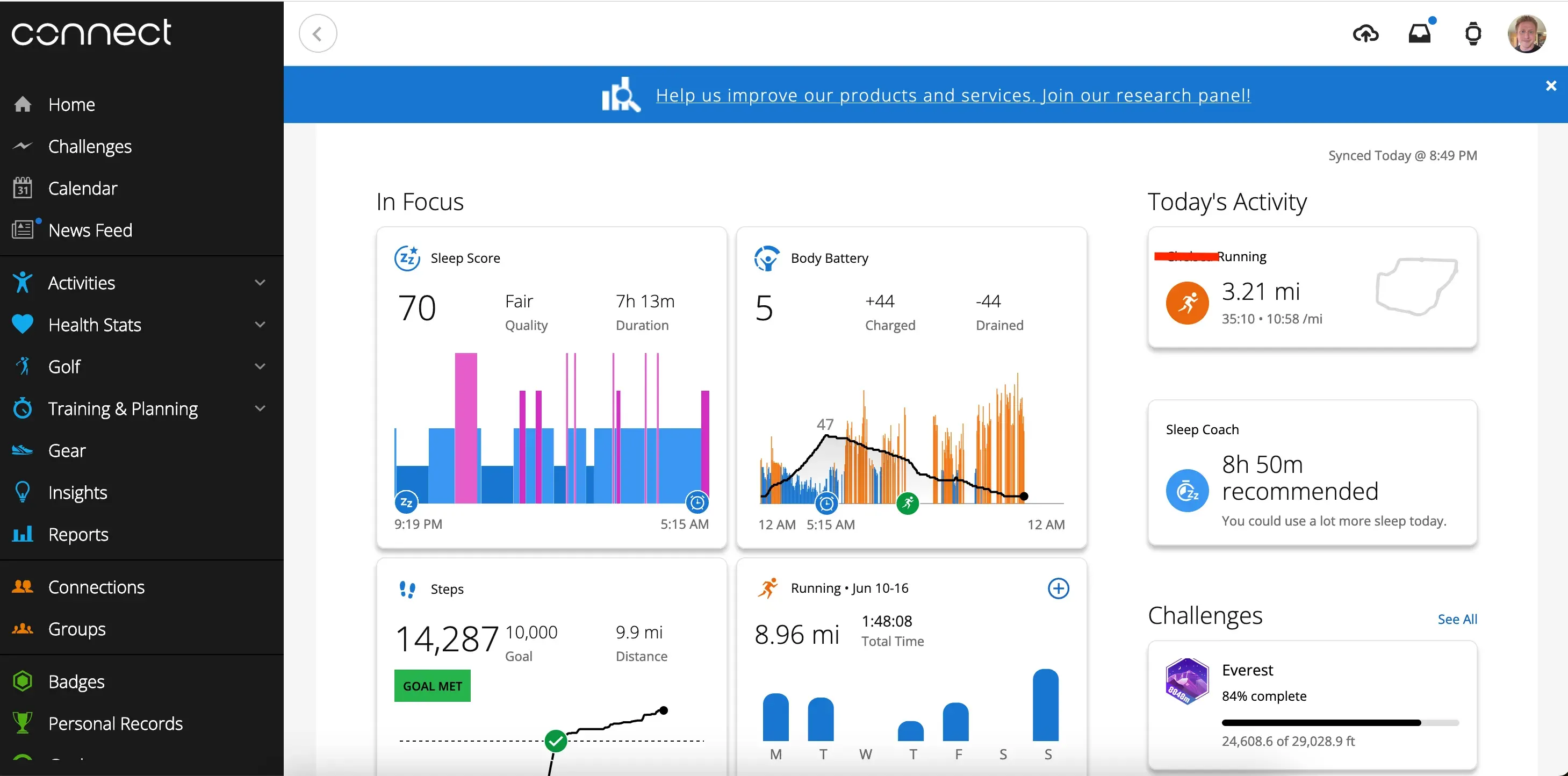 The watch stores all the fitness data locally on device and will periodically use a bluetooth connection to my iPhone to offload the data to garmin’s personalized cloud service called Garmin Connect. Logging in to connect.garmin.com provides a nice looking UI with tons of data: